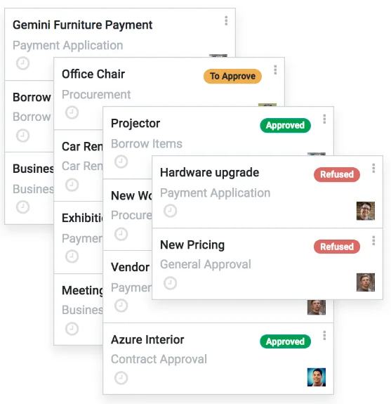 La gestión de tus solicitudes es más fácil: viajes, suministros de oficina, pagos, todos los envíos de solicitudes se pueden crear, validar o rechazar en segundos desde su tablero de aprobación.