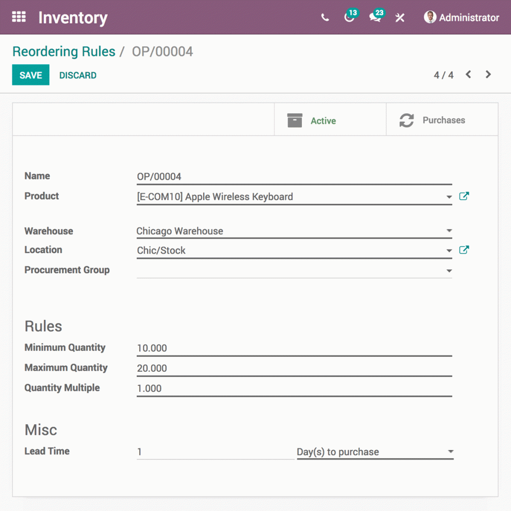 Mejora el rendimiento de tus compras e inventarios con reglas de aprovisionamiento según los niveles de existencias, reglas de logística, órdenes de venta, órdenes de fabricación pronosticadas, etc. Selecciona diferentes métodos de reabastecimiento para cada producto de acuerdo a tus estrategias de fabricación y entrega.