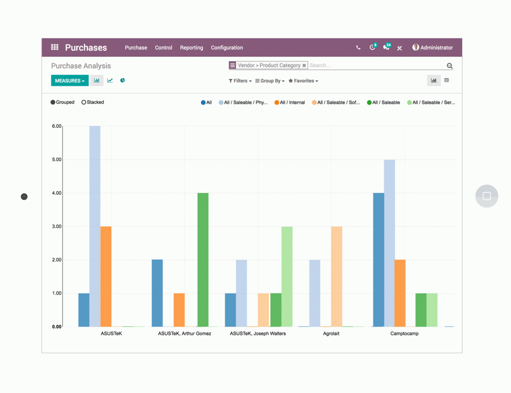 Obtén estadísticas precisas sobre el rendimiento de sus proveedores gracias a reportes flexibles: retrasos en entregas, descuentos sobre los precios, cantidades compradas, etc. Integra las compras con la contabilidad analítica para analizar la rentabilidad de tus contratos.