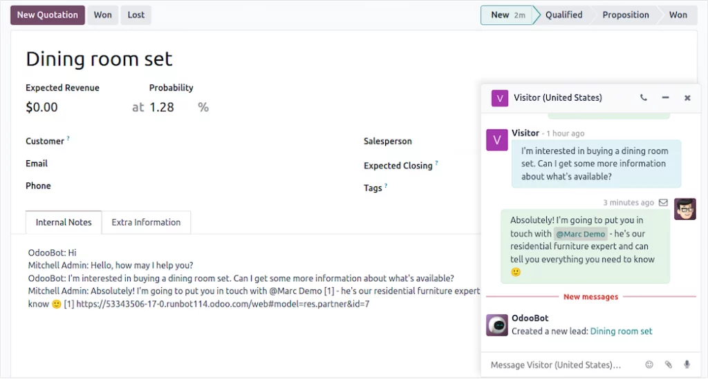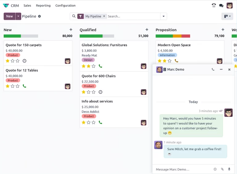 Simplifica la comunicación de tu equipo, envía mensajes privados directos y colabora en grupo en las aplicaciones de Odoo.