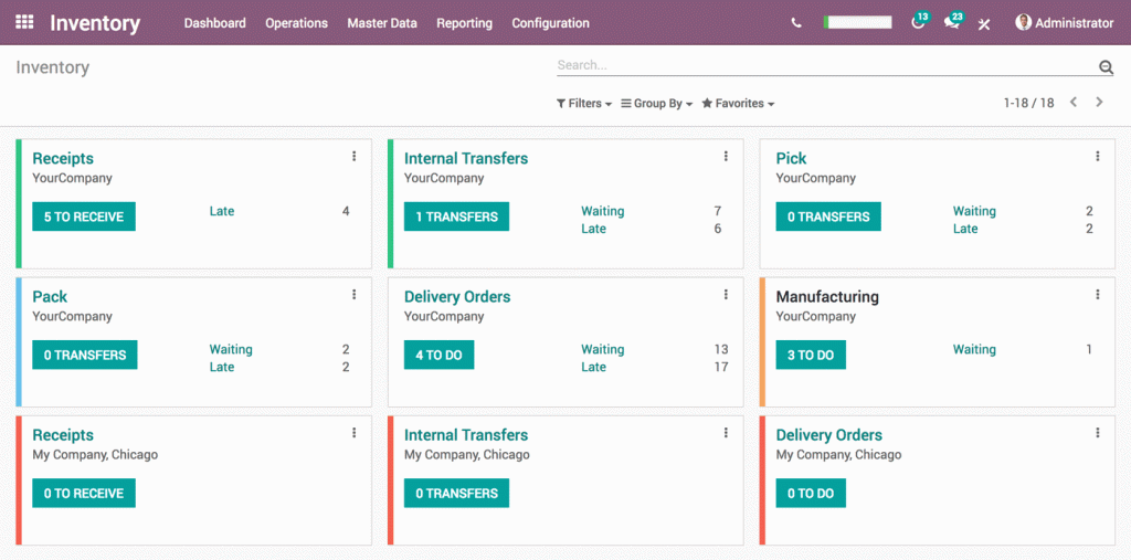 Obtén el método de almacenamiento más eficiente y mejora todas tus operaciones internas. El inventario de doble entrada de Odoo no tiene entradas, salidas o transformaciones de existencias. En su lugar, todas las operaciones se consideran movimientos de existencias entre ubicaciones.